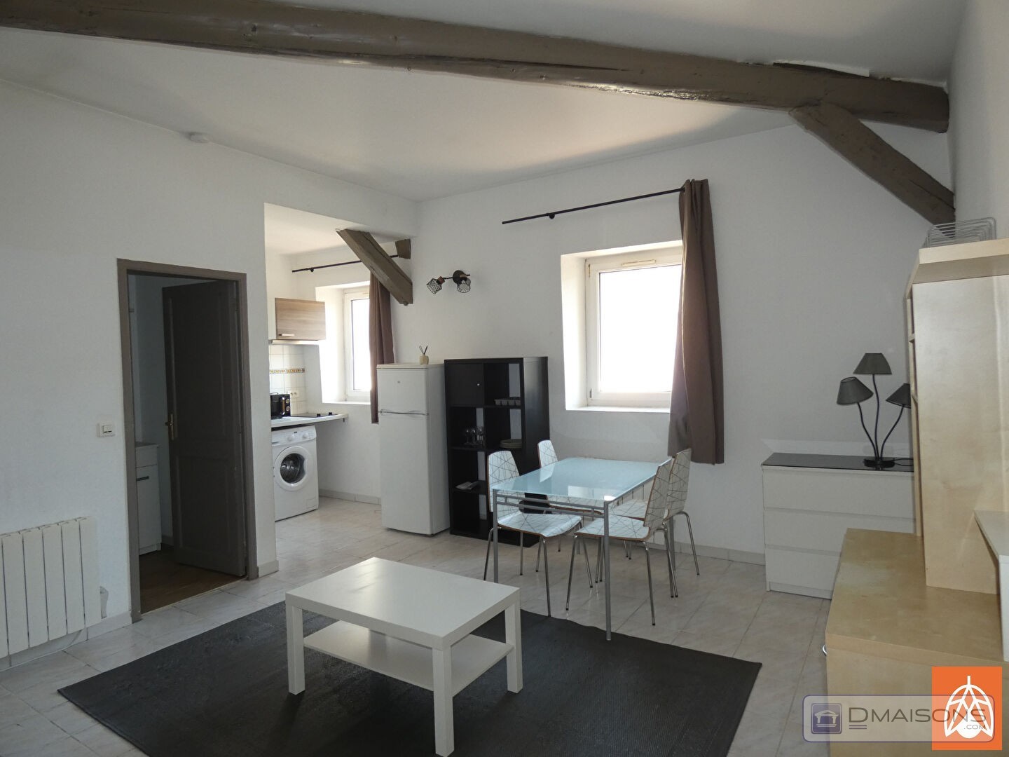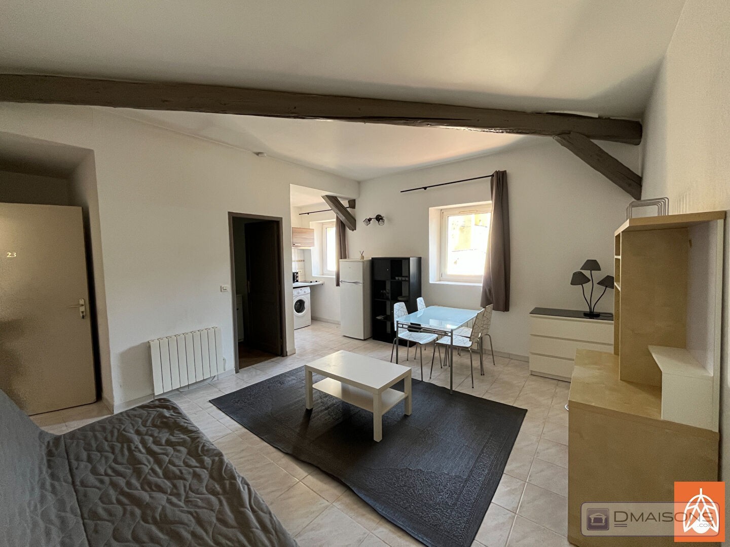 Vous apprécierez sa belle hauteur sous plafond et ses poutres apparentes, qui apportent du caractère et sensation d'espace.