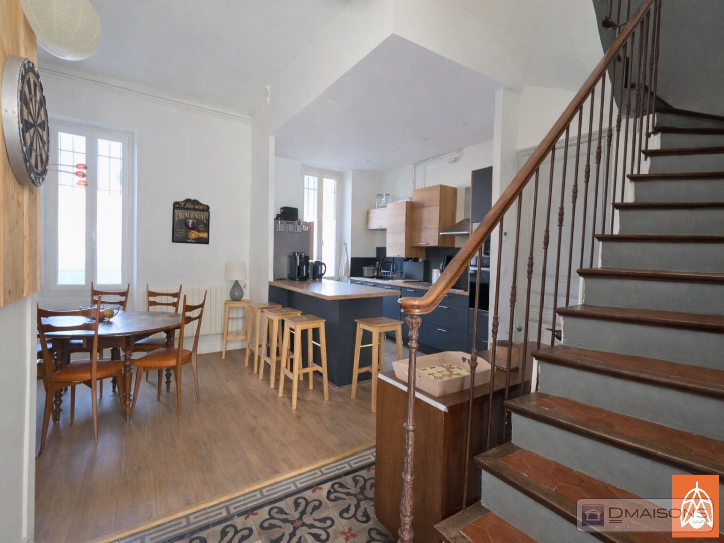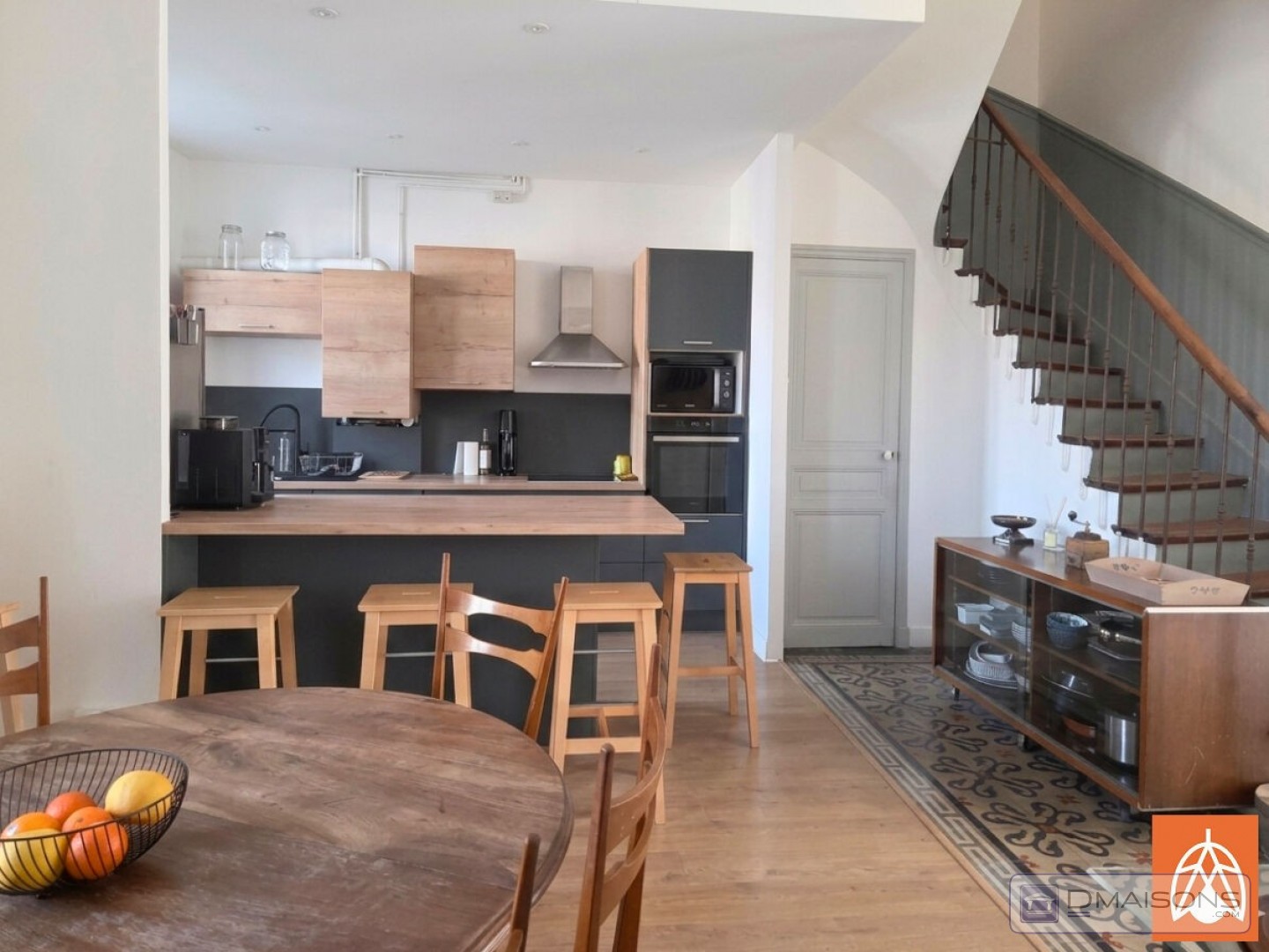 Elle se compose, au rez-de-chaussée d'une pièce de vie avec salle à manger et cuisine ouverte aménagée et équipée (plaque induction, hotte, four, lave vaisselle), d'un salon indépendant, d'un bureau, d'un cellier et de toilettes.